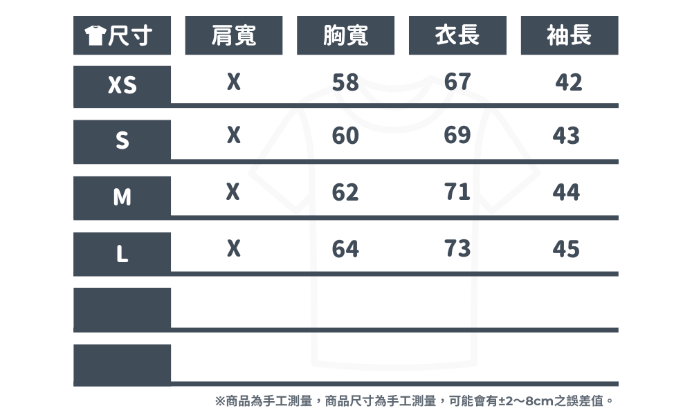 數據如下 (因此為拉克蘭版型無肩線,袖長從衣領量)